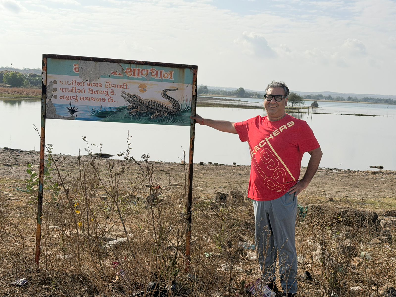 Near the riverbank stood a weathered signboard with a painted crocodile and a cautionary message. It was a reminder that this serene water hides wildlife beneath its calm surface. The Madhuvanti River, like many water bodies around Gir, supports a delicate ecosystem.